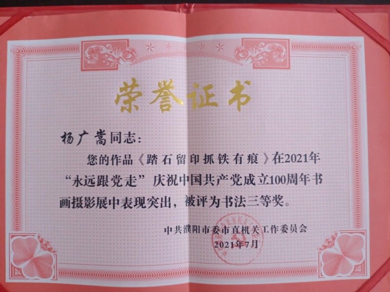 百年奮斗路,風華正茂時,楊廣嵩同志表示,值此建黨百年華誕之際,將獲獎作品贈送給市直工委,由市直工委轉贈與老黨員,慶祝黨的百年華誕,弘揚黨的光榮傳統(tǒng)和優(yōu)良作風,向老黨員致以崇高敬意。