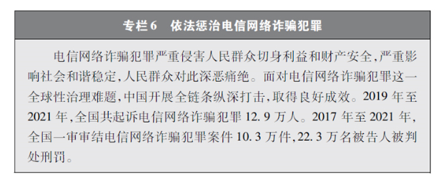 加大網(wǎng)絡(luò)犯罪懲治力度。隨著互聯(lián)網(wǎng)技術(shù)的快速發(fā)展,傳統(tǒng)犯罪加速向以互聯(lián)網(wǎng)為媒介的非接觸式犯罪轉(zhuǎn)變,電信網(wǎng)絡(luò)詐騙、網(wǎng)絡(luò)賭博、網(wǎng)絡(luò)淫穢色情等涉網(wǎng)違法犯罪多發(fā)。中國依法辦理新型網(wǎng)絡(luò)犯罪案件。連續(xù)多年開展“凈網(wǎng)行動”,嚴(yán)厲打擊群眾反映強(qiáng)烈的黑客攻擊破壞、侵犯公民個(gè)人信息等違法犯罪活動。持續(xù)推進(jìn)“云劍”“斷卡”“斷流”“拔釘”等專項(xiàng)行動,打擊套路貸、校園貸、“以房養(yǎng)老”、“投資養(yǎng)老”等電信網(wǎng)絡(luò)詐騙犯罪,依法懲處為電信網(wǎng)絡(luò)詐騙犯罪團(tuán)伙提供互聯(lián)網(wǎng)接入、域名注冊、服務(wù)器托管、移動互聯(lián)網(wǎng)應(yīng)用程序制作開發(fā)、網(wǎng)絡(luò)支付、引流推廣等服務(wù)支撐的黑灰產(chǎn)業(yè)。完善國家反詐大數(shù)據(jù)平臺和反詐移動互聯(lián)網(wǎng)應(yīng)用程序,建設(shè)國家涉詐黑樣本庫,完善快速止付凍結(jié)機(jī)制、涉詐資金返還機(jī)制。堅(jiān)決打擊網(wǎng)絡(luò)賭博犯罪行為,從嚴(yán)治理網(wǎng)絡(luò)淫穢色情。網(wǎng)絡(luò)犯罪治理工作取得明顯成效,人民群眾安全感有效提升,社會更加和諧穩(wěn)定。