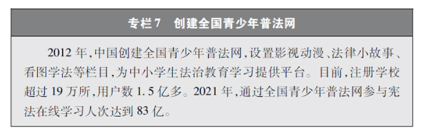 加強(qiáng)青少年網(wǎng)絡(luò)法治宣傳教育。青少年是祖國的未來、民族的希望。青少年網(wǎng)民在中國網(wǎng)民中的占比逐步增長。作為互聯(lián)網(wǎng)的“原住民”,青少年是網(wǎng)上學(xué)習(xí)、交流、生活最活躍的參與者、實(shí)踐者,其合法權(quán)益也更易受到網(wǎng)絡(luò)違法活動的侵害。中國從保護(hù)青少年網(wǎng)絡(luò)權(quán)益,促進(jìn)青少年健康成長、全面發(fā)展出發(fā),遵循青少年身心發(fā)展規(guī)律,貼近青少年學(xué)習(xí)生活實(shí)際,聚焦網(wǎng)絡(luò)沉迷、網(wǎng)絡(luò)欺凌、網(wǎng)絡(luò)淫穢色情信息等重點(diǎn)問題,通過普法微綜藝、兒童普法話劇、網(wǎng)絡(luò)普法故事廣播、網(wǎng)絡(luò)普法云課堂、學(xué)法用法知識競賽、法治副校長進(jìn)校園、編寫網(wǎng)絡(luò)普法讀本等生動活潑、豐富多彩的形式開展法治宣傳教育,逐步形成了政府、社會、學(xué)校、家庭相結(jié)合的法治宣傳教育格局,為提升青少年網(wǎng)民法治意識和網(wǎng)絡(luò)安全素養(yǎng)提供了全面保障。