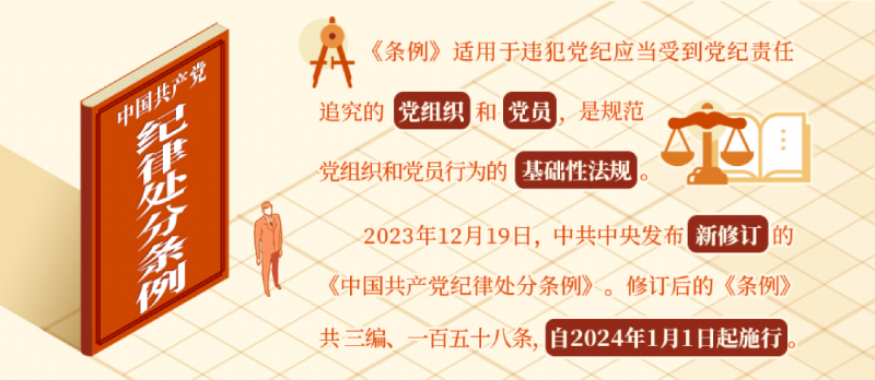 2023年12月19日,中共中央發(fā)布新修訂的《中國(guó)共產(chǎn)黨紀(jì)律處分條例》。修訂后的《條例》共三編、一百五十八條,自2024年1月1日起施行。