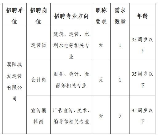 緩解濮陽城發(fā)運營有限公司人才短缺狀況,結合公司經營實際,現面向社會公開招聘專業(yè)人才4名。現將有關事項公告如下: