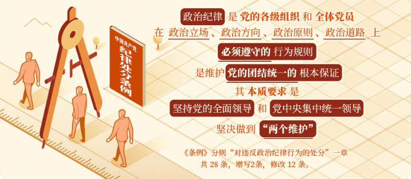 《中國共產黨紀律處分條例》第二編分則第六章是對違反政治紀律的行為的處分規(guī)定。新修訂的紀律處分條例第六章共 28 條,增寫2條,修改 12 條。